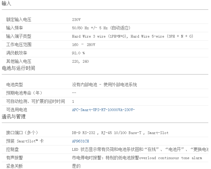 架式/塔式轉(zhuǎn)換當(dāng)從塔式遷移到機(jī)柜式安裝環(huán)境時(shí)保護(hù)對(duì)UPS的初始投資即插即用外部電池向UPS增加額外的運(yùn)行時(shí)間時(shí),保證負(fù)載干凈、不間斷的供電閃存可升級(jí)固件使用FTP遠(yuǎn)程安裝固件的修訂版。