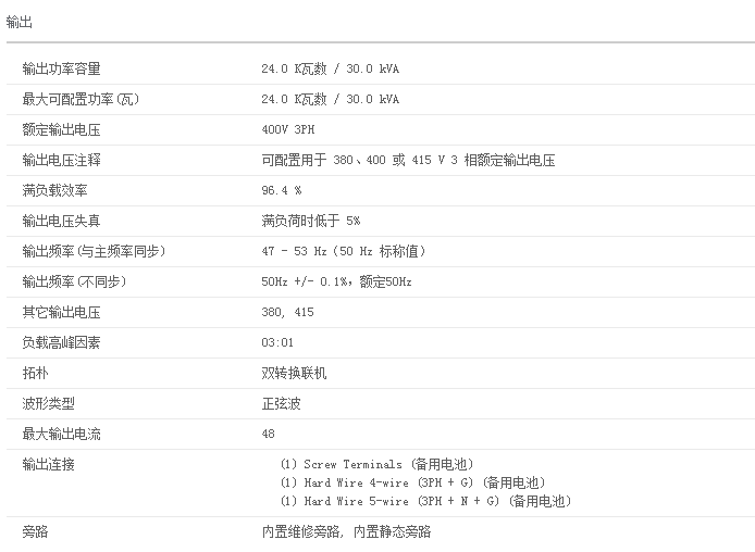 輸入功率因數(shù)校正通過(guò)使用小型發(fā)電機(jī)和電線(xiàn)連接,使安裝費(fèi)用少網(wǎng)絡(luò)管理通過(guò)網(wǎng)絡(luò)實(shí)現(xiàn)對(duì)于UPS的遠(yuǎn)程電源管理。手動(dòng)維護(hù)旁路不需要安裝外部機(jī)械旁路,可降低安裝成本。雙電源輸入將UPS連接到兩個(gè)獨(dú)立的電源中,增加了可靠性。可擴(kuò)展的運(yùn)行時(shí)間需要時(shí)允許快速增加更多的運(yùn)行時(shí)間熱插拔電池在更換電池的整個(gè)過(guò)程中,確保干凈、不間斷電源以保護(hù)設(shè)備