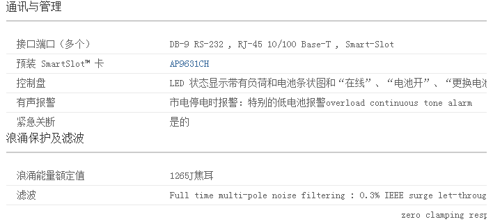 安全機構(gòu)的測試和認證意味著您可以部署Smart-UPS,并且確信它們能夠符合或超過業(yè)界嚴格的標準。通過容易、方便的遠程訪問能力來節(jié)省時間。通過串口、USB或可選的以太網(wǎng)進行網(wǎng)絡管理。包括PowerChute?網(wǎng)絡關(guān)機軟件,可實現(xiàn)方便的監(jiān)視和控制、安全的操作系統(tǒng)關(guān)機以及創(chuàng)新的能源管理功能。Avoids costly power problems by keeping your IT equipment data protected available.網(wǎng)絡級電源調(diào)節(jié)功能可防止浪涌的危害和破壞性的噪音。雙轉(zhuǎn)換架構(gòu)可提供嚴格的電壓調(diào)節(jié)、頻率調(diào)節(jié)、以及出現(xiàn)電力事故時轉(zhuǎn)換到電池的零轉(zhuǎn)換時間。Low operating maintenance costs with proven reliability intelligent battery management.由APC公司首創(chuàng)的智能電池管理可通過智能化、準確的溫度補償充電來提高電池的性能并延長其壽命。自動自檢確保了電池的可靠性并可在更換電池前向用戶發(fā)出警告。方便、易于連接、可熱插拔的電池模塊使得無需斷電就能進行電池更換。
